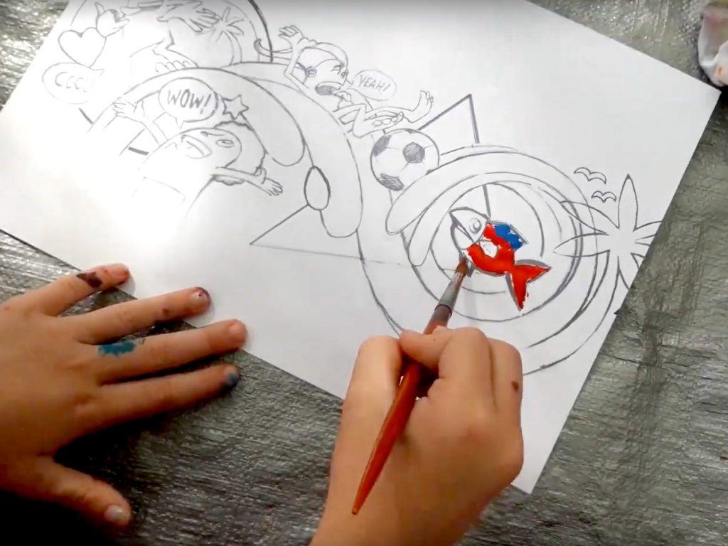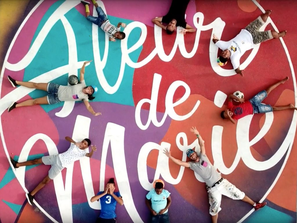 The title of the community art piece made in Fleur de Marie is “Kontekta”. The hands and feet portrayed in the